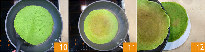 Meng nog even met de garde zodat de bloem volledig wordt opgenomen 7. Verhit nu een anti-aanbakpan van 22 cm goed en vet hem in met olie, giet dan een soeplepel beslag in het midden 8 en kantel de pan om het gelijkmatig te verdelen 9.