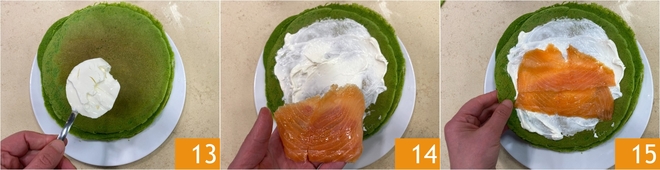 Als alle flensjes gebakken zijn, ga je verder met vullen: bestrijk de hele oppervlakte met verse smeerkaas 13, leg er vervolgens een paar plakjes gerookte zalm op 14. Vouw eerst de zijkanten naar binnen 15.