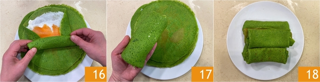 Als de zijkanten gevouwen zijn, rol je de flens op 16 zodat de vulling afgesloten wordt 17. Ga zo door om ook de rest te vullen. Je spinazieflensjes met zalm zijn klaar om van te genieten 18!