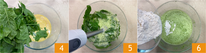 Voeg de verse spinazie toe, gewassen en goed uitgeknepen 4, en pureer met een staafmixer 5 totdat je een glad en homogeen mengsel krijgt. Roer op dit punt de bloem erdoor 6.