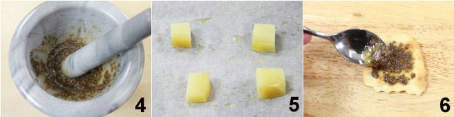 Begin met het maken van de truffelcr me: hak de truffel met een mes, en bewaar enkele kleine schaafsel voor de uiteindelijke garnering 1. Doe de truffel in een vijzel en voeg het halve teentje knoflook en de 2 ansjovisfilets toe 2, en begin de ingredi nten te stampen. Voeg vervolgens de extra vierge olijfolie toe 3