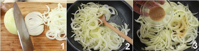 Begin met het bereiden van de gekarameliseerde uien: maak de uien schoon en snijd ze in plakken 1 die niet te dun zijn (met een mes of een mandoline). Verhit de olie in een anti-aanbakpan en laat de gesneden uien zachtjes stoven 2. Wanneer de uien glazig zijn, voeg je de rietsuiker toe 3 en roer je goed door.