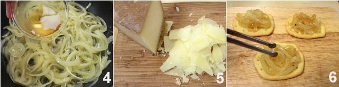 Wacht tot de uien gekaramelliseerd zijn en blus ze vervolgens af met witte wijnazijn 4. Breng op smaak met zout en peper en maak de uien gaar. Schaaf de Castelmagno in dunne schaafjes 5 en leg op elke Schiacciata “La Bottega di Olivia&Marino” een eetlepel gekarameliseerde uien 6 en garneer met de kaas. Werk elk hapje af met een takje verse tijm.