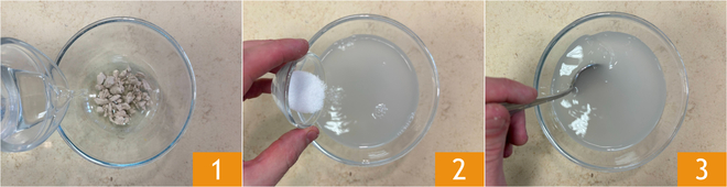 Om de vijfgranenfocaccia met vijgen en lardo te maken, begin je eerst met het deeg. Verkruimel de bakkersgist in een kom, voeg dan het water 1, de suiker 2 toe en roer om het op te lossen 3.