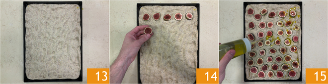 Druk met je vingertoppen over het hele oppervlak om de typische gaatjes van de focaccia te maken. Bedek met folie en laat nog 20–30 minuten rijzen 13. Verdeel de vijgenplakjes over de focaccia en druk ze lichtjes aan 14. Besprenkel het oppervlak met olie 15.