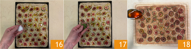 Voeg een paar vlokjes grof zout toe 16 en wat verse rozemarijn 17. Bak in een voorverwarmde heteluchtoven op 2200 gedurende 10 minuten met de bakplaat onderin, verplaats daarna de plaat naar boven en bak nog 15 minuten of totdat de focaccia krokant en goudbruin is. Haal de focaccia uit de oven en van de bakplaat, en besprenkel het oppervlak met kastanjehoning 18.