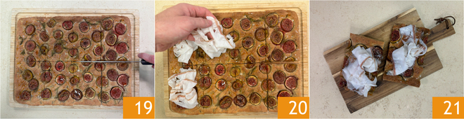 Snijd hem aan 19 en garneer elke plak met lardo di Colonnata 20. De vijfgranenfocaccia met vijgen en lardo is klaar om geserveerd te worden 21!