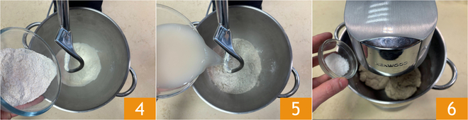 Doe in een keukenmachine met deeghaak (of in een andere kom) alle meelsoorten 4 en het water met de gist 5, en kneed tot je een homogeen deeg hebt. Voeg het zout toe 6.