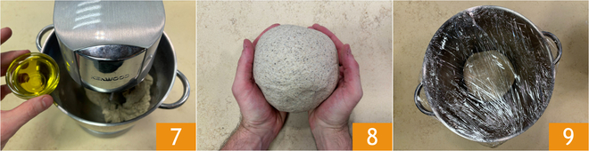 Voeg ook de olie toe 7 en kneed nog een paar minuten. Leg het deeg op het werkblad en kneed nog ongeveer 10 minuten, tot het glad en elastisch is. Vorm een bolletje 8 en leg het in een ingevette kom, afgedekt met folie 9 of een theedoek. Laat het ongeveer 2 uur rijzen, of tot het in volume verdubbeld is, op een warme plek.