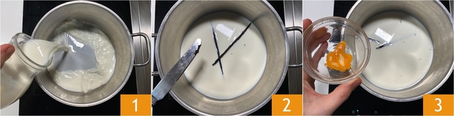 Om de carnavalsbeignets te maken, begin je met de banketbakkersroom: giet de melk 1 in een pannetje en breng deze op smaak met het vanillestokje en de zaadjes 2. Voeg ook de rasp van een halve sinaasappel toe 3 en breng net aan de kook.