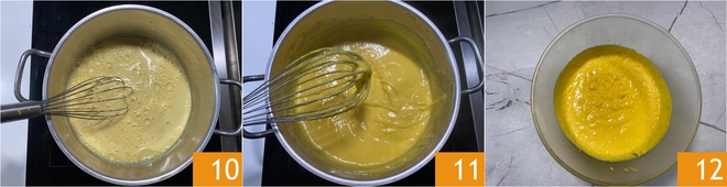 Kook op middelhoog vuur en blijf voortdurend kloppen met een garde 10 tot de gewenste dikte is bereikt 11; dit duurt ongeveer 6 minuten. Doe de banketbakkersroom in een kom, dek af met vershoudfolie direct op het oppervlak en laat afkoelen 12; doe hem daarna in een spuitzak met een gladde spuitmond.