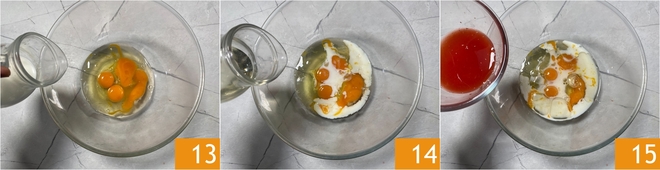 Bereid ondertussen het beslag voor: doe de eieren in een kom samen met de melk 13, de zonnebloemolie 14 en het sinaasappelsap 15.