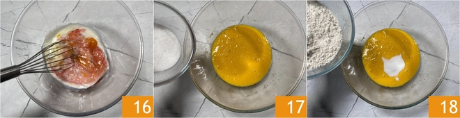 Klop de vloeibare ingrediënten met een garde 16. Voeg nu de droge ingrediënten toe: de suiker 17 en de bloem (tipo 00) 18.