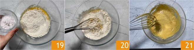 Voeg ook het bakpoeder voor gebak toe 19 en meng met een garde 20 zodat alle ingrediënten goed opgenomen zijn; let ook op de randen van de kom 21.