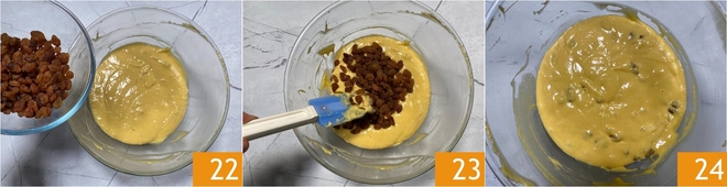 Voeg nu de rozijnen aan het beslag toe 22 en schep ze met een spatel er gelijkmatig doorheen 23 zodat ze goed verdeeld zijn 24.