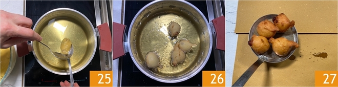 Klaar om te frituren: verhit de zonnebloemolie tot 160° en laat met behulp van 2 eetlepels het beslag in de pan glijden 25; om dit makkelijker te maken kun je de lepels eerst in de hete olie dopen. Frituur maximaal 4 beignets tegelijk zodat de olie niet te veel afkoelt 26. Als ze mooi goudbruin zijn — dat duurt ongeveer 4-5 minuten — laat je de beignets uitlekken op keukenpapier 27.