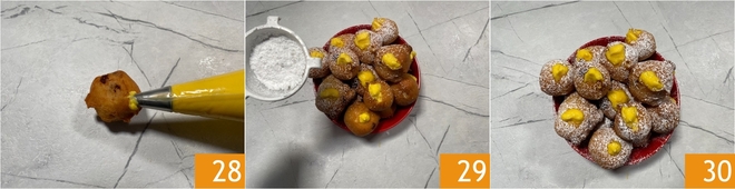 Neem nu de afgekoelde banketbakkersroom, prik met een prikker een gaatje in de onderkant van de beignets en vul ze door de spuitmond van de spuitzak in het gaatje te steken 28. Bestrooi naar smaak met poedersuiker 29 en je carnavalsbeignets zijn klaar om te worden gegeten 30!