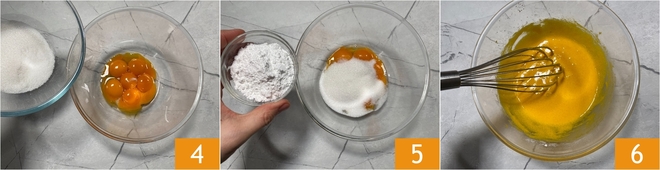 In een aparte kom meng je de eidooiers, de suiker 4 en het rijstzetmeel 5, en klop je alles goed met een garde om het geheel te binden 6.