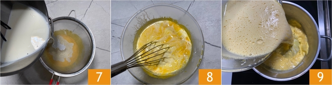 Giet de gezeefde warme melk in de kom 7 en roer voorzichtig om te mengen 8; zet het mengsel daarna terug in het pannetje 9.