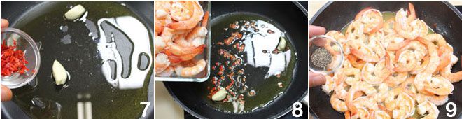 Het bereiden van garnalen met knoflook en chili is heel eenvoudig: bak de garnalen in de pan met olie, knoflook en verse rode chili en breng ze op smaak met gemalen zwarte peper.