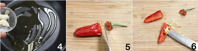 voeg dan twee teentjes knoflook toe en laat deze goudbruin worden 4. Bereid ondertussen de chilipeper: was hem, verwijder de steel 5 en snijd hem doormidden om alle zaadjes te verwijderen 6,