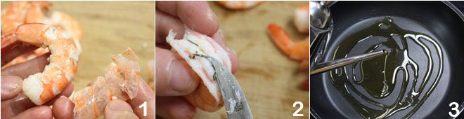 Om de tapa garnalen met knoflook en chili te bereiden, begint u met het schoonmaken van de garnalen: pel ze 1 en verwijder, met behulp van een mes, het zwarte darmkanaal 2. Verwarm een pan met 6 eetlepels extra vergine olijfolie op matig vuur 3,
