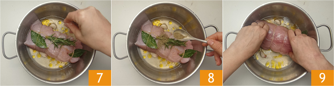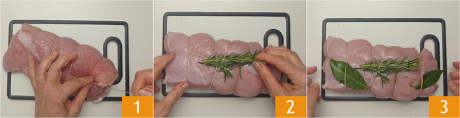 Om het kalkoenbraadstuk in de pan te bereiden, bindt u eerst de kalkoenborst strak met keukentouw 1; hier vindt u alle details van deze handeling: Hoe bind je een gebraad. Steek een takje rozemarijn 2 en twee laurierblaadjes 3, gewassen en gedroogd, in de binding.