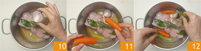 Schild een ui en voeg de helft in de pan 10. Maak de selderij schoon en een wortel en voeg deze bij het vlees 11. Was de peterselie en voeg deze toe aan de andere ingrediënten 12.