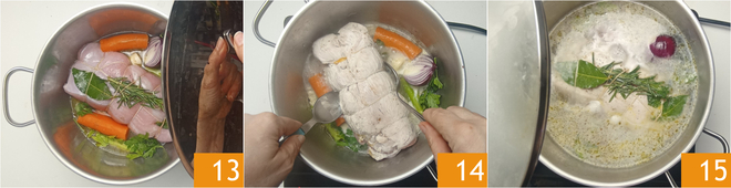 Dek de pan af met een deksel en laat 30 minuten in de koelkast marineren, draai het vlees na 15 minuten om 13. Zet de pan op middelhoog vuur om de alcohol uit de wijn te laten verdampen 14. Voeg daarna zoveel water toe dat het vlees volledig onderstaat 15. Sluit de pan met het deksel en ga verder met sudderen op laag vuur gedurende nog ongeveer 60 minuten of tot het vocht tot onder de helft van het vlees is gedaald.