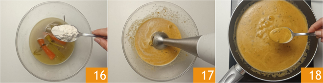 Haal het vlees uit de pan en giet het braadvocht in een kom, voeg de bloem toe 16 en pureer met een staafmixer 17. Giet het braadvocht in een koekenpan en laat het een paar minuten op laag vuur koken zodat het indikt 18.