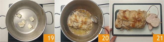 Doe de boter in de pan 19, voeg het vlees toe en bak het twee minuten per kant aan 20. Laat afkoelen en verwijder het keukentouw voordat u het in plakken snijdt 21. Zo is het in de pan gebraden kalkoen klaar; serveer het met het braadvocht.