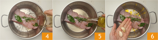 Doe het vlees in een pan, giet de witte wijn erbij 4, voeg extra vierge olijfolie toe 5 en twee ongeschilde teentjes knoflook 6.