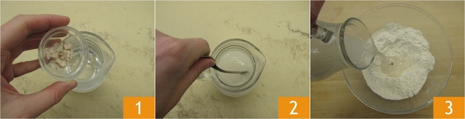 Om de gefrituurde pizzareepjes te maken, giet eerst de gist in de helft van de aangegeven hoeveelheid water 1. Roer goed zodat het oplost 2 en giet het in een ruime kom waarin je de bloem al hebt gedaan 3.