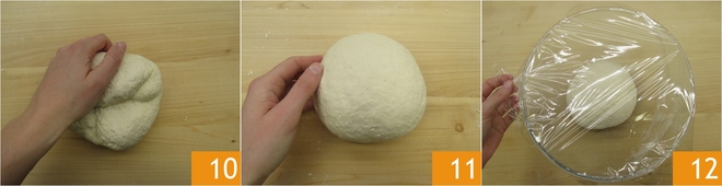 Wanneer je een vrij gladde textuur hebt verkregen 10, vorm je een bal 11 en leg die in een kom. Dek af met folie 12 en laat 6 uur rijzen op kamertemperatuur.