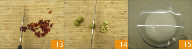 Na deze tijd hak je de zongedroogde tomaten fijn 13 en snijd je de olijven in plakjes 14. Pak vervolgens het deeg dat in volume verdubbeld is 15.