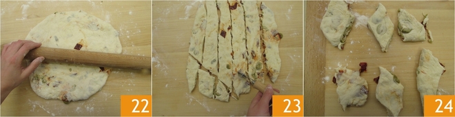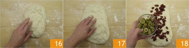 Leg het op een werkvlak 16 en laat de lucht eruit door het met je handen plat te drukken 17. Voeg de zongedroogde tomaten en olijven toe 18.