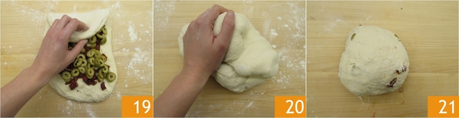 Vouw het deeg dicht om ze te incorporeren 19 en kneed snel 20 totdat je een homogeen mengsel krijgt 21.