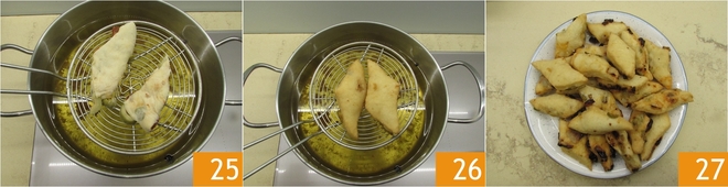 Verhit de olie goed en dompel steeds een paar stukjes tegelijk onder, gebruik een schuimspaan 25, bak tot ze mooi goudbruin zijn. Laat ze uitlekken 26, leg op keukenpapier, bestrooi met een snufje zout en serveer je gefrituurde pizzareepjes 27.