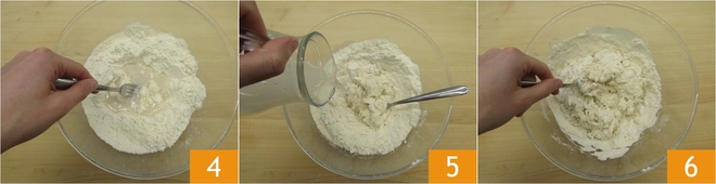 Begin met roeren met een vork 4, voeg daarna het resterende water toe 5 en roer nogmaals 6.