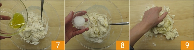 Voeg olie toe 7 en tenslotte het zout 8. Blijf in de kom werken, zet het daarna op het werkvlak en ga door met kneden 9.