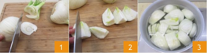 Om de gegratineerde venkel met bechamelsaus te bereiden, maak je eerst de venkel schoon door de topjes en de onderkant af te snijden 1. Verwijder de stevigere buitenste bladeren, halveer ze en was ze onder stromend water, en snijd ze vervolgens in vrij grote parten 2. Doe de venkel in ruim kokend gezouten water 3 en blancheer ze 5-6 minuten.