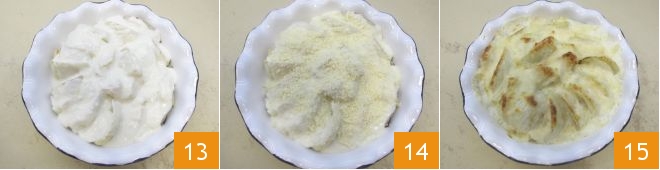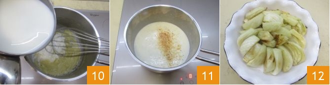 Giet nu de hete melk erbij 10 en blijf roeren totdat de saus is ingedikt. Breng tenslotte op smaak met zout en een snufje nootmuskaat 11. Haal de in de pan aangebakken venkel en leg ze in een ovenschaal van 25 cm diameter, of in elk geval groot genoeg om ze in één enkele laag te kunnen leggen. Schik ze waaiervormig vanaf de buitenrand 12.
