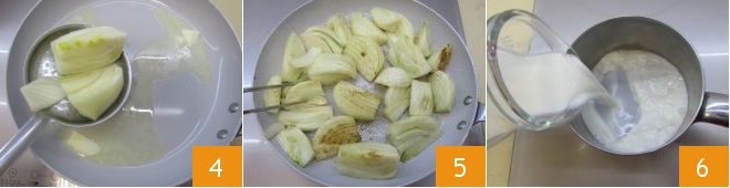 Smelt in een ruime koekenpan 35 g boter op laag vuur. Als de boter gesmolten is, giet je de venkel goed af en leg je ze in de pan 4. Bak ze ongeveer 5 minuten goudbruin, keer ze af en toe zodat ze aan beide kanten een korstje krijgen 5. Zodra ze klaar zijn, zet je het vuur uit en ga je verder met de bechamelsaus: verwarm de melk in een pan 6.