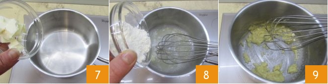 Smelt in een ander steelpannetje 30 g boter 7, voeg vervolgens de gezeefde bloem geleidelijk toe 8 en blijf voortdurend roeren met een garde om klontjes te voorkomen 9.