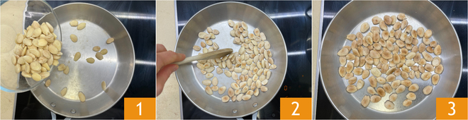 Om geroosterde amandelen in de pan te maken, verwarm je een pan (bij voorkeur van staal met een dikke bodem, maar je kunt ook een anti-aanbakpan gebruiken) op middellaag vuur. Zodra de pan heet is, giet je de amandelen in de pan 1 en rooster je ze op laag vuur ongeveer 10 minuten, regelmatig roerend 2. Wanneer ze heel heet en mooi goudbruin zijn, zijn je geroosterde amandelen klaar 3!