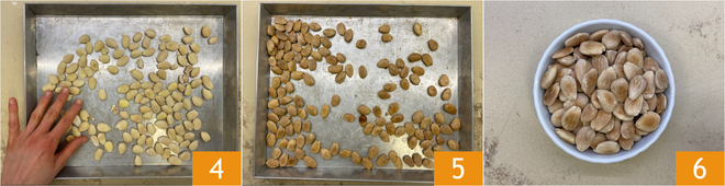 Om geroosterde amandelen in de oven te bereiden, verdeel je de amandelen over een bakplaat met voldoende afstand tussen de stukjes 4. Bak in een voorverwarmde oven op 180°C gedurende ongeveer 15 minuten of tot ze goudbruin zijn 5, houd de oven in de gaten zodat ze niet verbranden. Haal ze uit de oven en laat ze afkoelen. Je geroosterde amandelen zijn klaar om van te genieten 6!