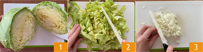 Om de verze sofegae te bereiden, maak de savooiekool schoon door de meest beschadigde buitenste bladeren te verwijderen: je krijgt ongeveer 700 g. Was hem goed onder stromend water, snijd hem met een scherp mes eerst doormidden 1 en hak hem vervolgens fijn 2, waarbij je het harde middendeel weglaat dat verwijderd moet worden. Maak de ui schoon en hak deze fijn 3.