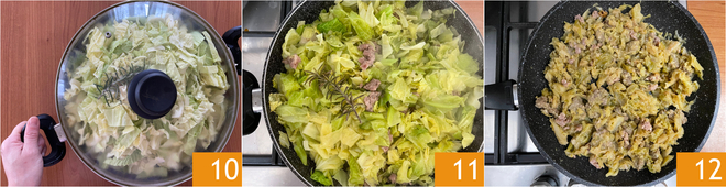 Dek af met het deksel 10 en laat 1 uur op laag vuur sudderen, af en toe roeren 11. Als de verze tijdens het koken te droog worden, kun je wat hete groentebouillon toevoegen. Zodra de verze sofegae goed gestoofd zijn, zet je het vuur uit en serveer je ze warm 12.