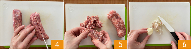Verwijder het vel van de worstjes 4 en verkruimel ze met je handen 5. Pel ook het teentje knoflook 6.