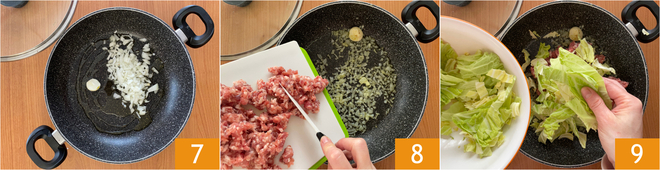 Giet de olie in een ruime pan, voeg de gesnipperde ui, het teentje knoflook 7 toe en laat dit goed fruiten op het vuur. Voeg vervolgens de verkruimelde worst en de savooiekool in reepjes toe, voeg het takje rozemarijn toe en breng op smaak met zout en peper 9.